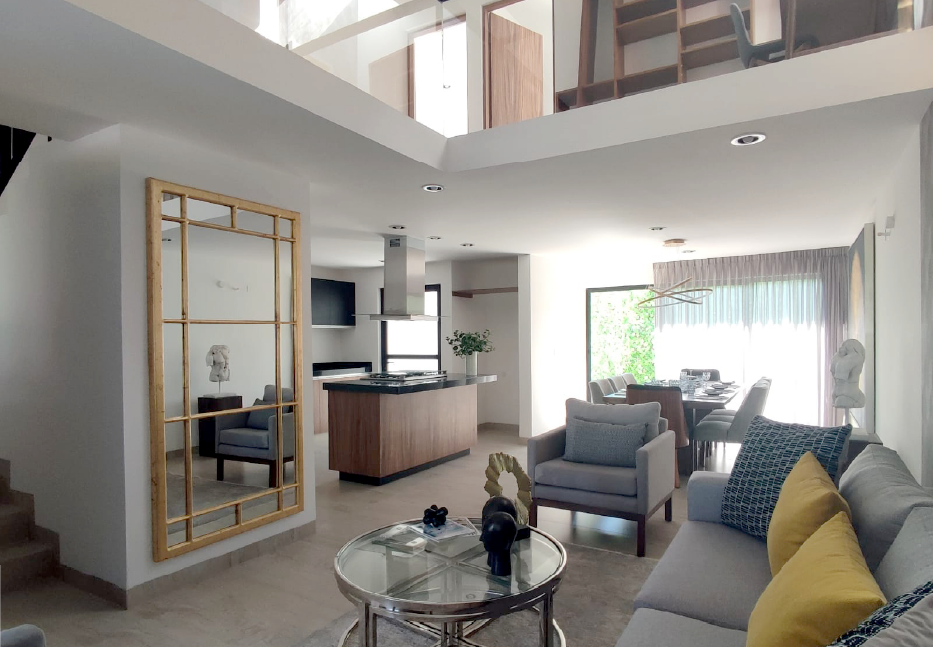 Elegante casa con una imponente doble altura, con excelente iluminación y un diseño optimizado que maximiza la utilidad de todos los espacios. Se entrega con cocina integral con estufa y área de almacenamiento, baño completo y una cómoda recámara con vista al área social. El modelo se encuentra en los últimos niveles y cuenta con una amplia terraza privada.